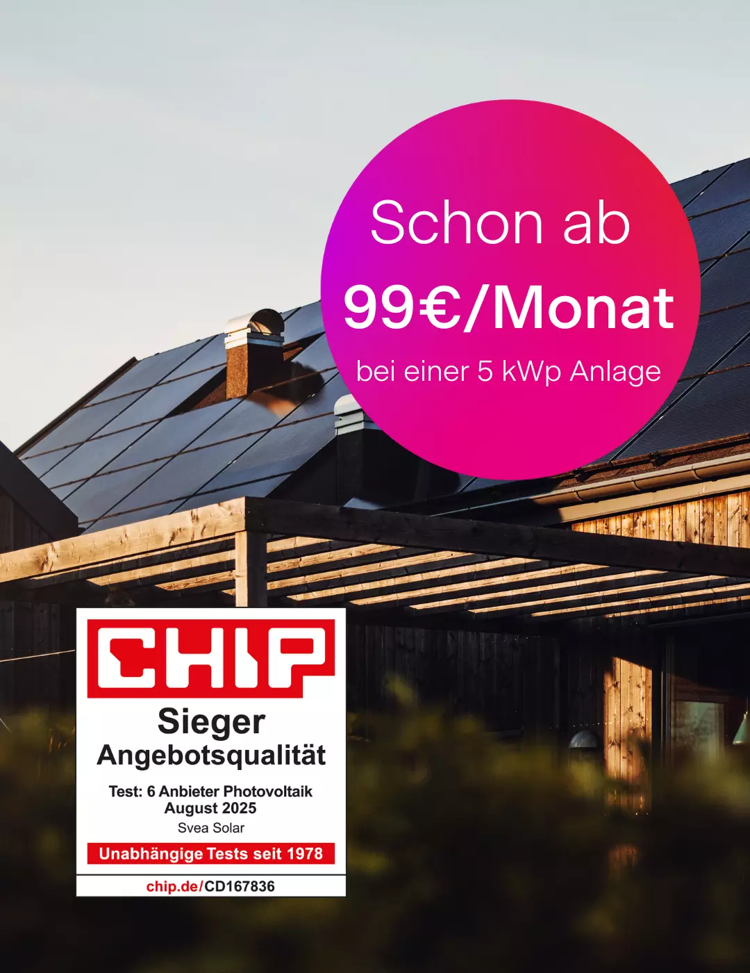 Svea Solar+ ist eine umfassende Rundum-sorglos-Lösung für deinen Einstieg in die Solarenergie. Das Paket kombiniert Technik, Service und Finanzierung in einem monatlichen Modell – bereits ab 99 €.
